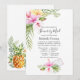 Watercolor summer long distance baby or bridal shower by mail invitation featuring orange and pink hibiscus, pineapple and eucalyptus.