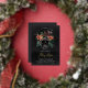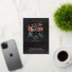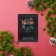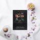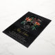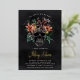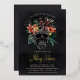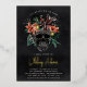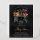 A spooky chic Halloween themed bridal shower invitation featuring a tropical floral skull illustration topped with orange and burgundy island flowers and green jungle foliage on a smoky black background. Personalize this unique and elegant Halloween bridal shower invitation with your event details in off-white lettering. Gold foil accents lend luxe appeal to this stunning invitation.