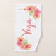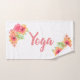 Serviette à sueur à thème Yoga faite en blanc avec deux coins décorés de fleurs tropicales oranges et corail. Le texte corail, au milieu de la serviette, dit Yoga.