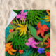 A vibrantly coloured tropical print featuring tropical flowers and palm leaves on a black background. In colours of purple, turquoise, orange, green and black.