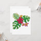 A watercolour pencil drawing of a tropical pink flower with green leaves.