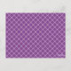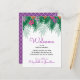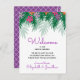 This wedding welcome card features an illustration of bright coloured tropical flowers and palm tree branches across the top of the invite. The backside is purple with a white lattice style pattern.