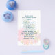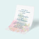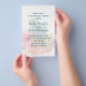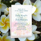 Budget wedding invitation template with a tropical background design. White paper with dark blue text to customize in three sections. Pineapples and exotic, tropical flowers decorate the background in green, pink, orange and yellow. All the favourites of the tropics are included such as plumeria flowers, hibiscus, and bird-of-paradise. The invitation comes in three sizes. Transfer the design to any paper upgrade if you prefer.