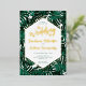 This tropical wedding invitation features a green and white colour scheme. A cute gold script font is used for the heading and couple's names, and in sans-serif is the details of the event, including the location, date, time and RSVP. The background features a hexagon with a gold foil border, and green palm leaves for tropical summer style. ••• For more wedding suites, visit my store Zazzle.com/EventsByJessicaAmber ••• For custom orders, message me on Zazzle