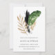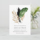 Wedding invitation features tropical greenery and gold foliage. Perfect look for summer and modern eco weddings.