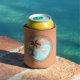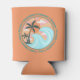 Simple classic beachy looking beverage can cooler with fun colourful retro Illustration of green palm trees, blue waves, orange sun, and yellow and pink sunrays. Surrounded by words related to summertime... Waves, Beach Parties, Good Vibes, Cocktails, Summer, Friends, Laughter, Sun, and Surf. Cool can cooler for use during bbq beach or backyard parties and to have handy at your patio or poolside tiki bar.