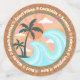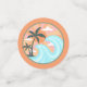 Simple classic cork textured-looking table confetti with fun colourful retro Illustration of green palm trees, blue waves, orange sun, and yellow and pink sunrays. Surrounded by words related to summertimes... Waves, Beach Parties, Good Vibes, Cocktails, Summer, Friends, Laughter, Sun and Surf. Really fun beach party table decor confetti to give your bbq or backyard party a little extra festive vibe.