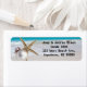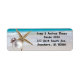 Tropical Christmas holiday custom address labels with template text. Starfish and ornament over ocean water and beach sand.