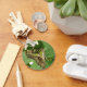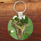 This stunning keychain features a photograph of a beautiful tropical butterfly. It has beautiful iridescent green markings all over its wings. It has its wings folded while it rests on some leaves. The photograph was taken using macro photography for a stunningly detailed result.