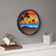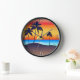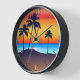 Clock in an image of a tropical island, with palm trees, against an orange sunset and turquoise ocean, with gold numbers
