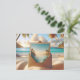 A sandy beach features an open envelope revealing a framed scene of a tropical island