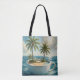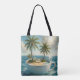 Tropical island with palm trees and a hammock hanging over sand, in a teacup floating on ocean waves, illuminated by sunlight