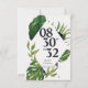 Modern and informal wedding Save The Date card featuring a beautiful illustration of green tropical jungle leaves. Easily add your ceremony date and the bride and groom's names in dark grey fonts over a geometrical white shape background.