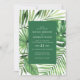 Tropical leaf and script watercolor wedding invite. Hand painted script text. Part of a on trend summer collection. Background colour can be changed.