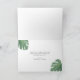 This trendy and elegant thank you card features watercolor monstera, fiddle leaf fig, and pothos vine leaves in green on a simple blush pink and white background. Modern hand-written script in green is also featured.