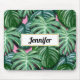 A personalized mousepad with a summery feel. Backgrond is a pattern of exotic tropical philodendron leaves in green. Hand painted digital image. A white frame with a faux gold foil border layered over top with your name written inside.
