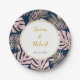 Tropical leaves pink, navy blue and gold paper plate. This lovely design showcases leaves of Split Leaf Philodendron (Monstera deliciosa) or Swiss Cheese Plant and palm leaves in blush pink with gold outline on navy blue. Your text is in a white frame with gold outline.