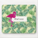 A mouse pad with a green tropical leaves pattern and a white frame with a gold border layered over top. A pink flamingo illustration adds a touch of whimsy. Personalize with your name or other text inside the frame.