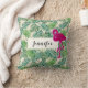 A personalized pillow with a green tropical leaves pattern and a white frame with a gold border layered over top. A pink flamingo illustration adds a touch of whimsy.