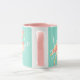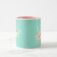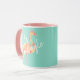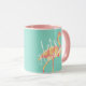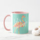 Tropical pink flamingo patterned in pineapples mug with a cute mint green background and the phrase "Let's Flamingle".