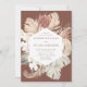 Elegant, modern tropical wedding invitations featuring your wedding details framed by a border of watercolor flowers and tropical foliage in earthy shades of tan, beige, rust, brown, sage, and dark green with a brown background. The unique, tropical wedding invitations reverse to a sage green watercolor background.