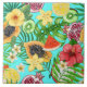 Tropical mix-fruit, flowers and leaves on blue tile