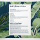 A watercolor illustration of green tropical leaves set on a dark navy blue background adds a chic aesthetic to this stylish tri-fold brochure. A bold font on the front showcases your brand name against the dark background on the front cover. Update the customizable text to fit your brand, and personalize the details throughout the brochure for your own usage. These 5x7 brochures are the perfect size to display your price lists and menu of services, or describe your product line. A great marketing piece to hand out to potential clients to quickly introduce your business. Please contact the designer for help with special typesetting or layout variations. Art and design © 1201AM Design Studio | www.1201am.com