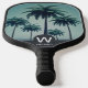 Monogram pickleball paddle featuring a modern tropical palm tree design. Customize the text with your desired monogram and name. Use the template to create your own monogram pickleball paddle.