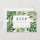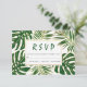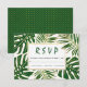 Tropical leaves green and gold wedding RSVP response card. This lovely design showcases leaves of Split Leaf Philodendron (Monstera deliciosa) or Swiss Cheese Plant and palm leaves in green with gold outline. Your text is in a white frame with gold outline. The back includes a gold polka dot pattern on dark green. Choose it for your tropical beach wedding, coastal wedding or destination wedding.