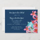 New year’s eve home party invitation with a tropical theme. Navy blue with big ornament and pink plumeria flowers design. Text is light blue and easy to customize for your holiday party.
