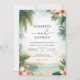 Evoke a sense of tropical paradise with this vibrant design, featuring lush greenery and exotic blooms framing a serene beach scene. The artistic watercolor style creates a light and airy feel, perfect for a destination affair.