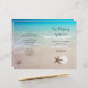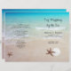 Tropical beach wedding folded ceremony program. Turquoise ocean water and smooth beach sand is the background for this custom program that will be folded in half. Casual font in dark grey is easy to customize on four "pages". Sand dollars and starfish decorate to represent the couple.