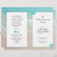 Beach wedding folded Catholic / Christian long ceremony program template, to add lots of text to all four pages. Christian scripture or a verse can be added to the back page along with a thank-you message to family, friends and guests. Scenic blue ocean water and sandy beach image on paper to be folded AFTER PURCHASE.