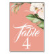 This elegant table number card features a watercolor style floral theme, with an image of a tropical Hawaiian style bouquet. Beautiful white orchids are paired with monstera and palm leaves in the top right corner. The background is a luxurious coral shade, with the table number printed in white.
