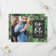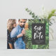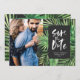 Modern tropical palm leaf watercolor foliage photo save the date cards. Hand painted script text. Part of a on trend summer collection. Background colour can be changed.
