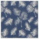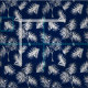Tropical print fabric featuring a pattern of white palm leaves on a midnight blue background.