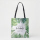 Modern tropical palm leaf watercolor foliage bachelorette party or holiday tote. With space for the brides name, the party of holiday destination and the date of the bachelorette. Hand painted effect script text. Part of a on trend summer collection. Background colour can be changed.