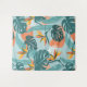 Cool tropical tapestry design with palm leaves, hibiscus, and abstract shapes in green, blue, and brown colours.