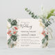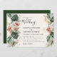 This Tropical Palm Wedding invitation features a tropical pink flowers, palm and monstera leaves, elegant golden splashes. The reverse side of this invitation is dark green . Perfect for a modern beach wedding.