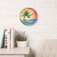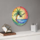 This round wall clock features a vibrant illustration of a tropical sunset. A silhouetted palm tree stretches over a colourful beach scene, complete with gentle waves and a radiant sun. The clock face has clear numerals and black hands, blending functionality with artistic design. It's perfect for adding a touch of tropical paradise to any room.
