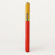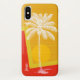 Stylish iPhone case, with graphics of a palm tree over an orange and yellow abstract sunrise background. Personalize the custom text for yourself or as a great gift idea.