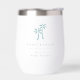 These elegant minimalist wine tumblers make great bridal party gifts or destination wedding favours. Clean minimal design features your n names, wedding date, and location in classic black serif lettering. A duo of tropical palm trees in turquoise teal blue completes the design.