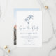 This simple minimal tropical beach wedding save the date card features two palm trees at the top, with classic elegant text, in a white and dusty blue colour scheme, with a photo template on the back.