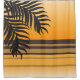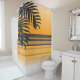 Tropical shower curtain with a silhouette palm tree over orange and taupe brown sunset ocean stripes