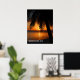 Belize Poster. Beautiful tropical palm trees on the beach at Southwater Caye, Belize. A warm orange sunset replects in the ocean behind