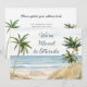 Tropical Palm Trees Beach Scene Moved to Florida New Address Cards... Our tropical themed change of address card features a beach scene with three watercolor palm trees bordering your moving announcement text and new address. Example text on front of the card reads "We've Moved to Florida" in elegant script typography with your name and new address below. The back of the card displays all the details your family and friends need to know about your new location. You can easily revise all example text on front and back of the card using the personalization template.