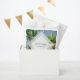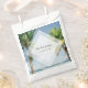 This design features tropical palm trees on a beach. The beautiful greenery of the palms contrast against the blue sky and water. The opaque white diamond element brings the modern typography to the forefront. A perfect fusion of modern and chic. Palm tree greenery design ideal for a tropical beach destination wedding. Beach wedding favour bag design with modern elements. Matching wedding invitations and other stationery items are also available.