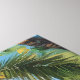 A breathtaking tropical beach with golden sand, turquoise waters, and lush greenery. Towering palm trees sway gently in the breeze, while vibrant flowers bloom along the shoreline. Rocky cliffs frame the secluded cove, creating a perfect paradise under a brilliant blue sky with fluffy white clouds.