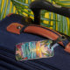 Pretty luggage tag with a gorgeous ai impasto oil painting style illustration of the blue ocean, a sandy beach surrounded by palm trees at sunset.