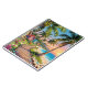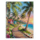 A beautiful notebook with a seaside tropical paradise illustration of a boardwalk along the coast, with palm trees with coconuts and strung fairy lights, blue ocean waves and small whimsical cottages.
